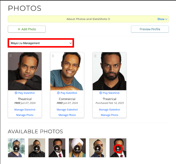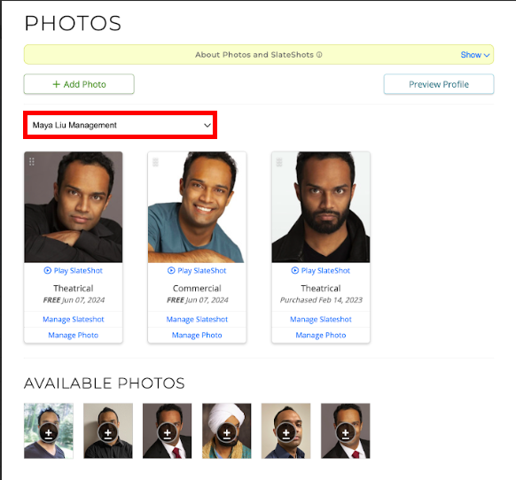1) Go to the Photos section of your Actors Access account, you will see tabs listing your AA Profile as well as your Talent Reps.