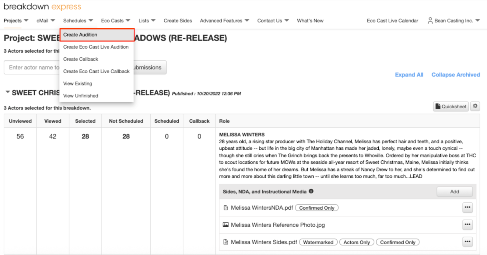 Once you've selected the submissions that you're interested in, you can create a schedule for in-person auditions.