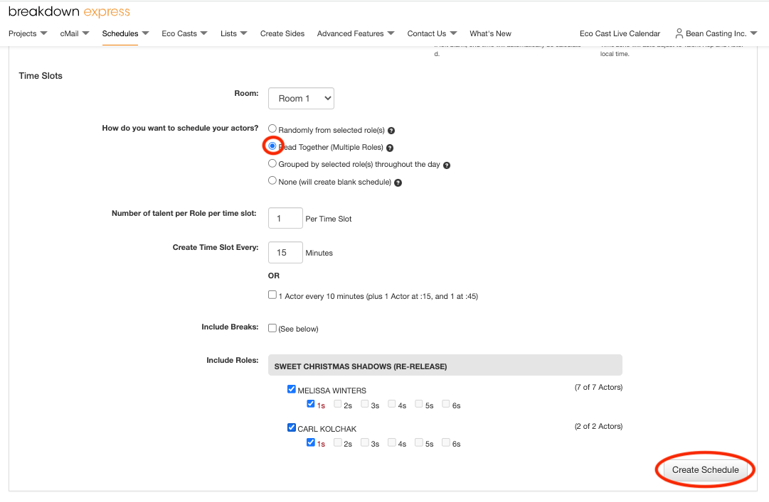 Read Together (Multiple Roles): To have Actors for different roles audition together, use this option. Input the number of talent you want per role per time slot, length of each time slot, and check the roles/selection numbers you'd like to include.