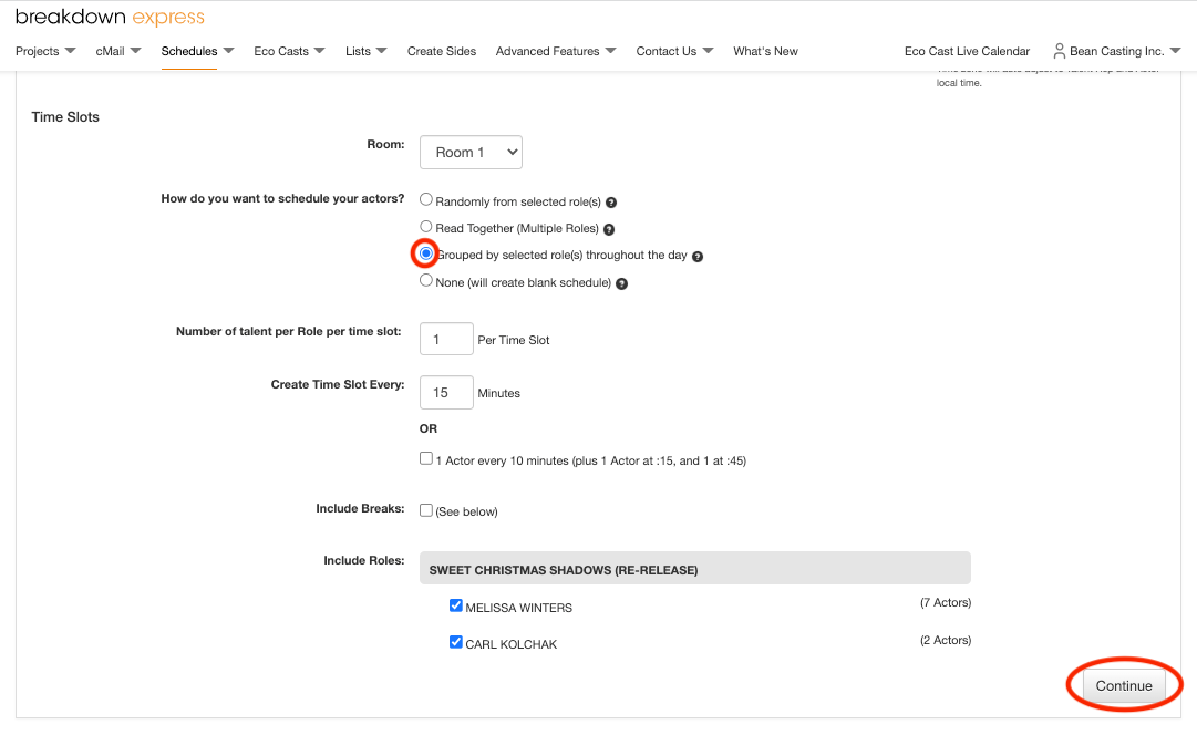 Grouped by selected role(s) throughout the day: Select this option to group audition time slots by role throughout the day. This allows you to isolate the roles in the schedule. Input the number of talent per time slot, length of each time slot, and check the roles/selection numbers you'd like to include. Select Continue.