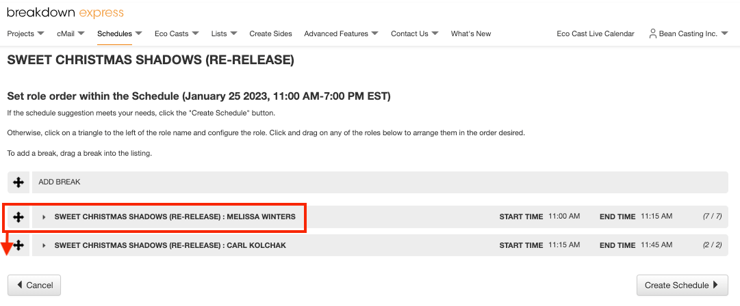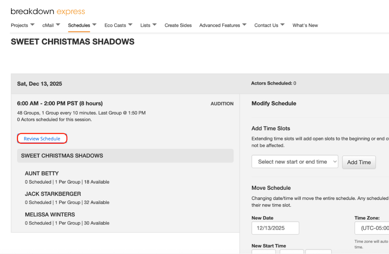 3) If needed, you can now manually adjust the Actors' times as necessary. Click here for guidance on editing your schedule.