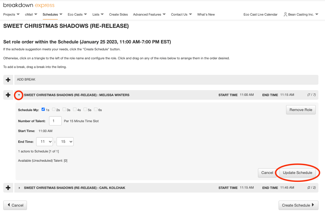 To customize the options for each role click on the triangle beside the role name. A drop-down menu will open with options to adjust the time slot preferences. You can change the select number, change the number of Actors per time slot, or define an end time for that role. Click Update Schedule to save your changes.