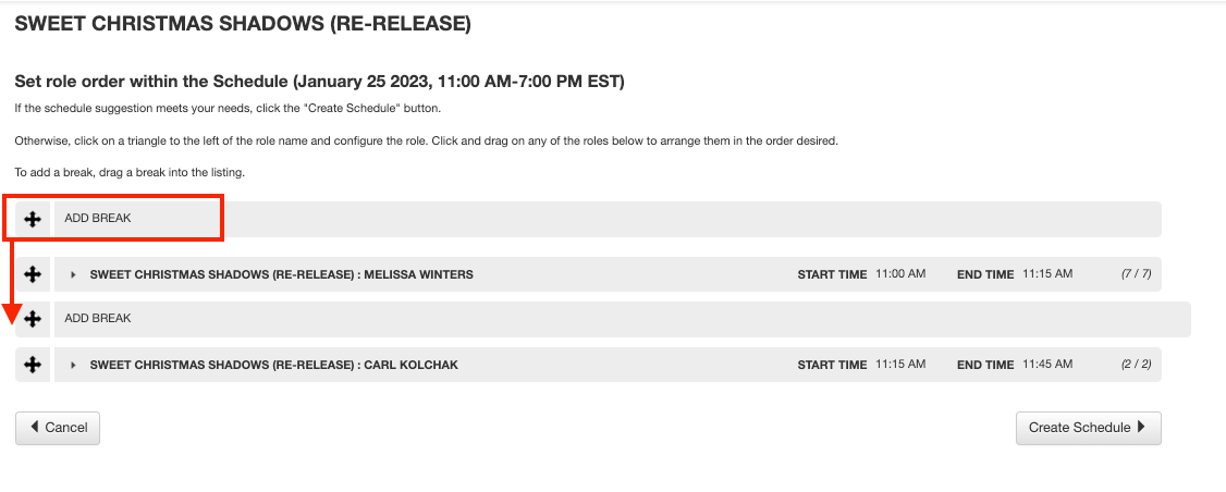 On the next page, you can adjust the order of your schedule. Click and drag the role up or down to the appropriate time slot.