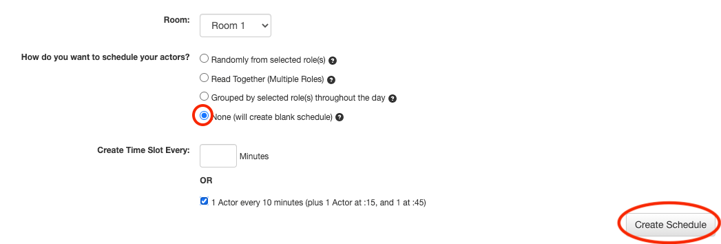 3) In the How do you want to schedule your actors section, there are four different options for adding Actors into your schedule. The four options are: Randomly from selected role(s), Read Together (Multiple Roles), Grouped by selected role(s) throughout the day, and None.