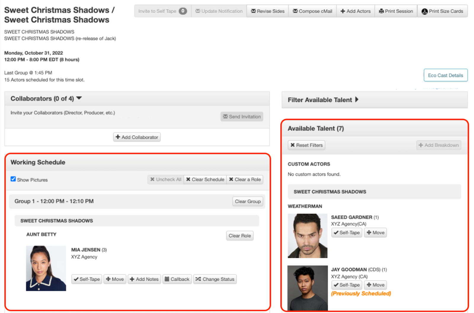 2) The Working Schedule section holds all of the time slots and the Actors that are placed into each time slot. The Available Talent section holds all of the submissions that you've selected from all of your roles.