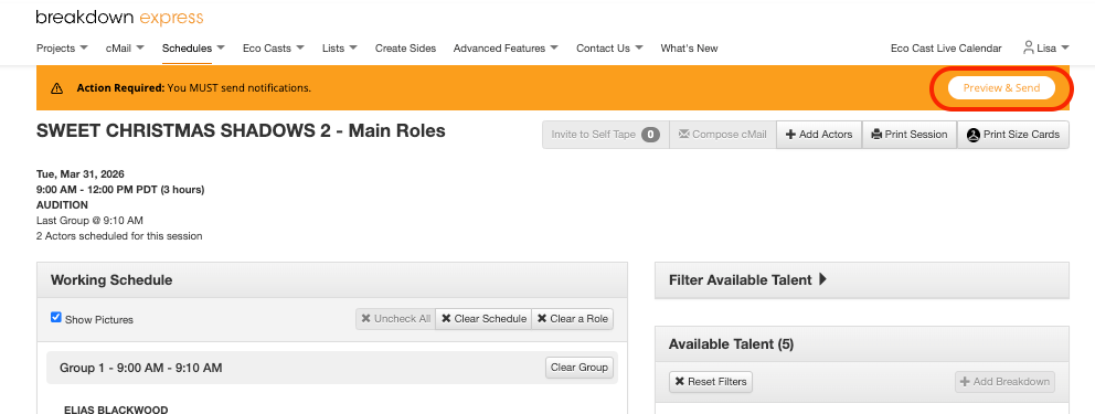 1) Once you have reviewed your schedule and you've got the Actors in the times you want, select Preview & Send to prepare the invitation to your audition.