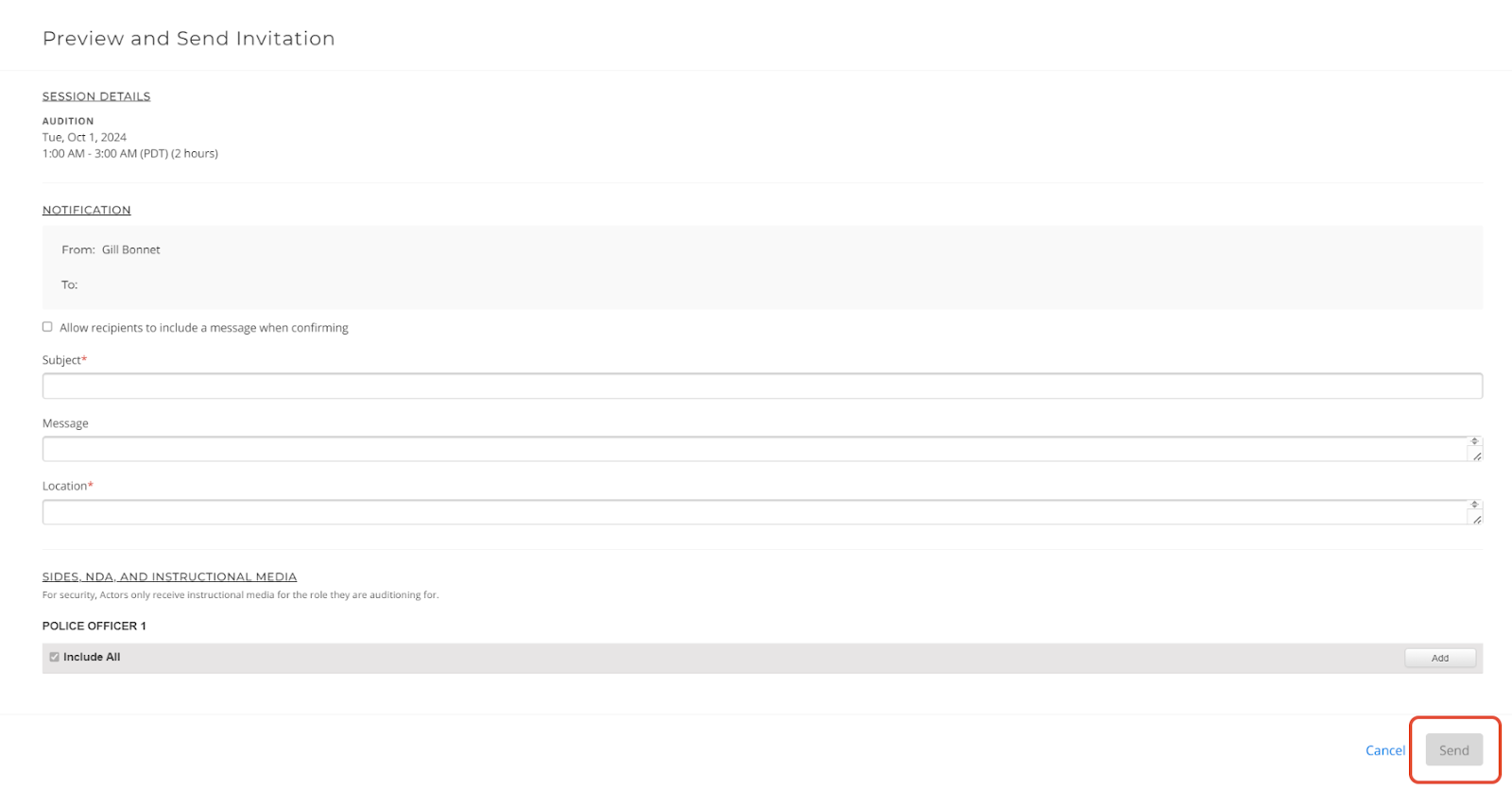 2) On the Preview & Send pop-up window, fill out the message fields, specifying notes for the audition and the location address. The actor will receive only their scheduled time and will display their local time to them.
