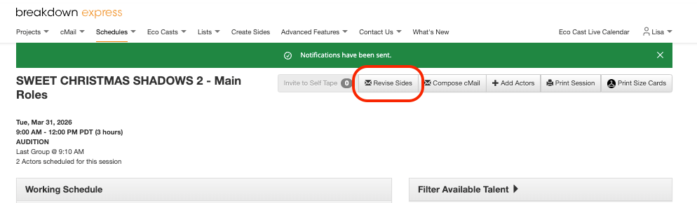 Note: Once the invitation has been sent, its sides and other audition reference materials can be revised when you click on the Revise Sides button in the Working Schedule section. Files uploaded through the Revised Sides button will remain available as attachable files for the role henceforth but will not be automatically sent to the role’s other existing audition invitations.