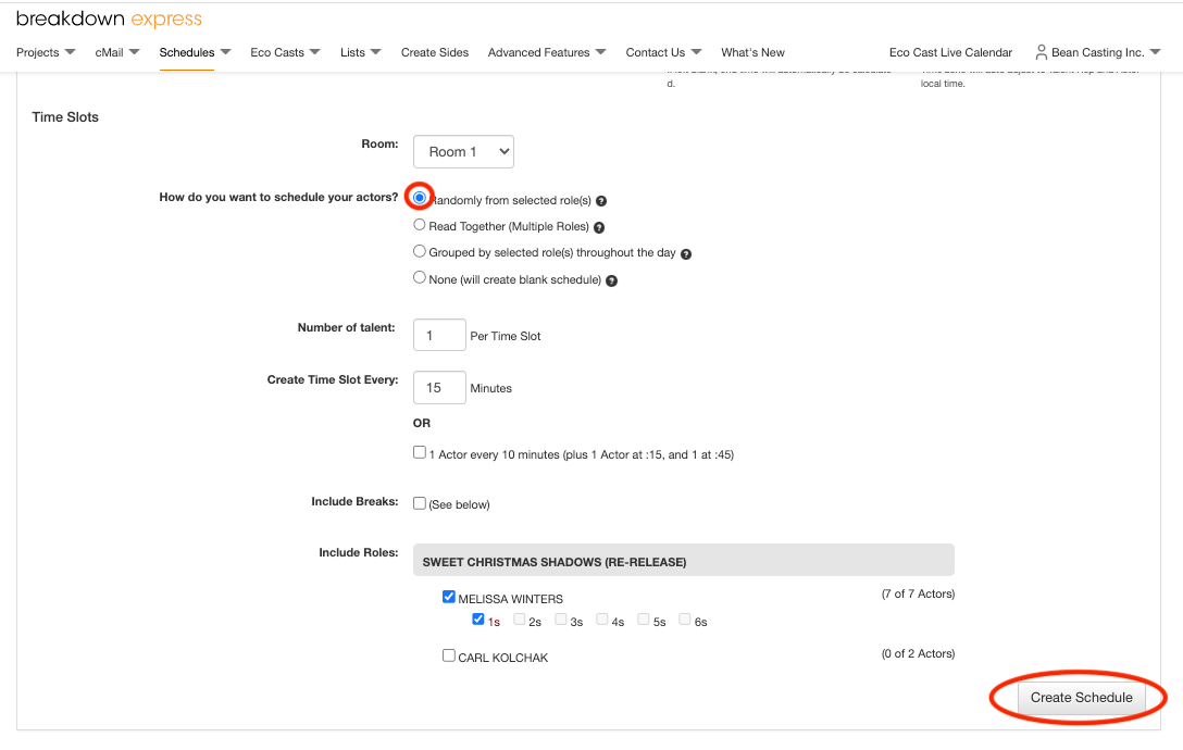 Randomly from select role(s): This option will populate the selected Actor(s) randomly into the schedule. Input the number of Actors you want to audition per time slot in the Number of Talent box and then add the length of each time slot. Check the Include Breaks box if you'd like to include a break, and then select the roles/selection numbers you'd like to include in the Include Roles section.