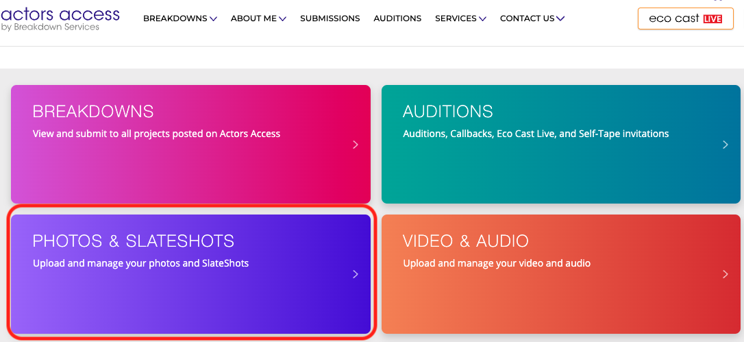 - You can add SlateShots from the PHOTOS & SLATESHOTS section of your account.