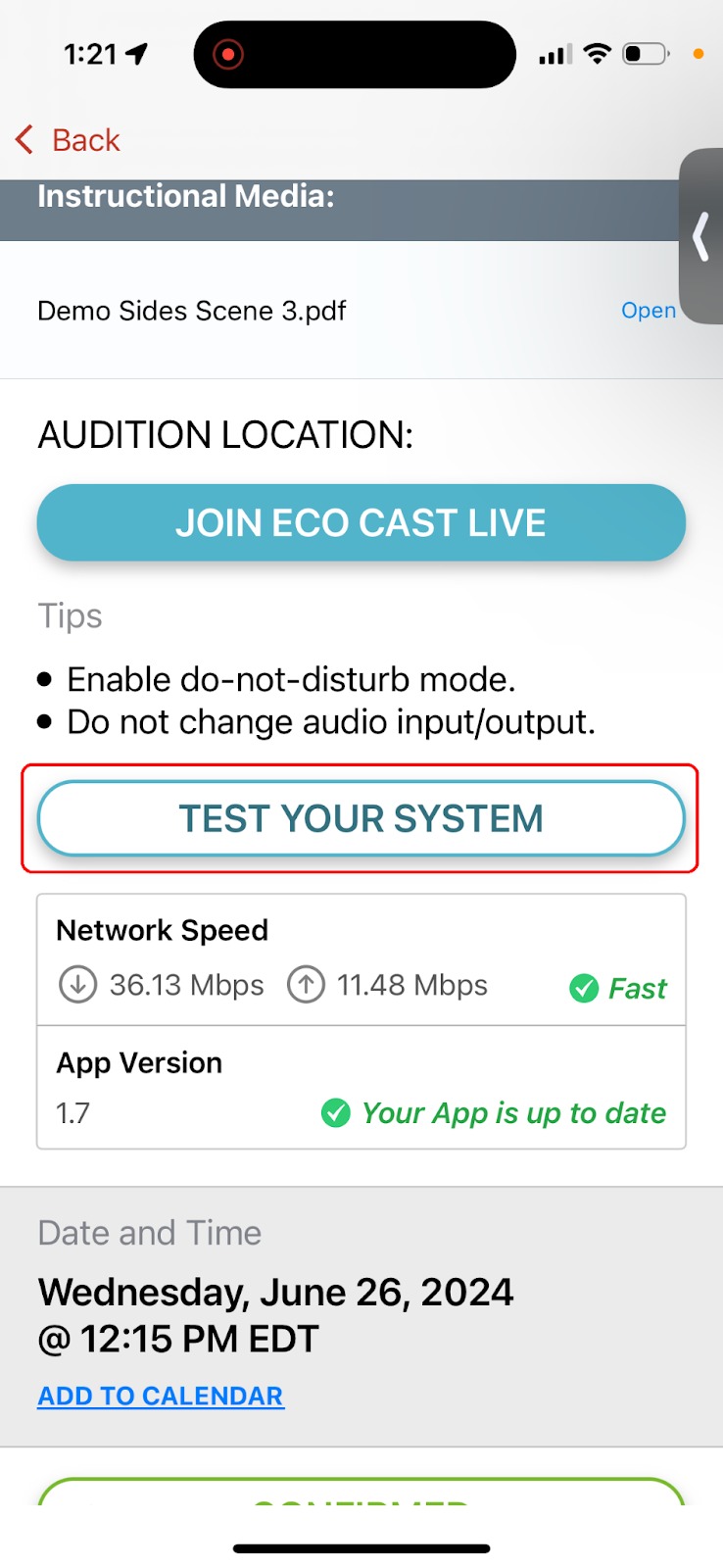 1. Before joining an Eco Cast Live session through the App, we recommend that you click TEST YOUR SYSTEM, to check that your device is ready.