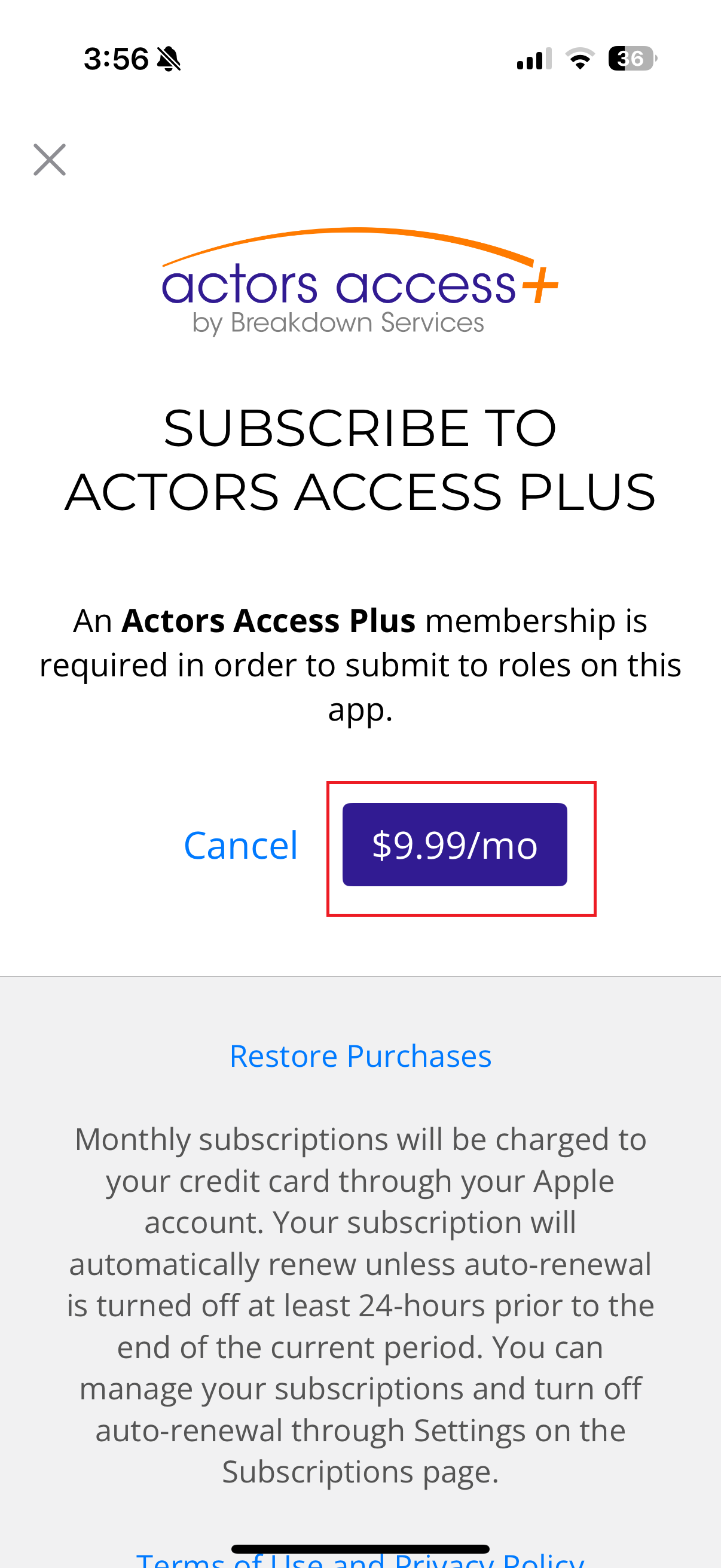 Subscribe through the Actors Access iOS App for a monthly membership ($9.99 per month + Apple App Store processing fee).