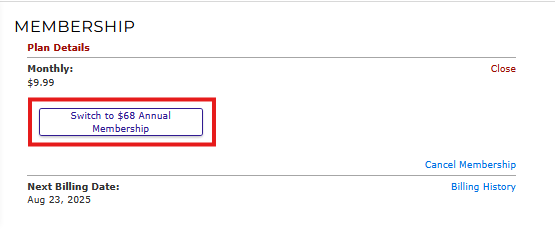 13) Then click on Switch to $68 Annual Membership (or Switch to $9.99 Monthly Membership).