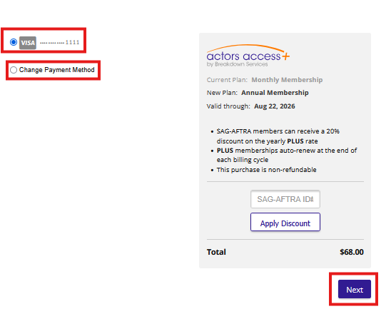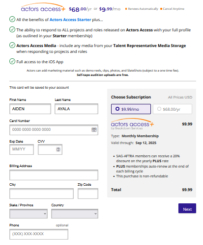 You can register for an annual or monthly Actors Access PLUS membership right on your Actors Access profile!