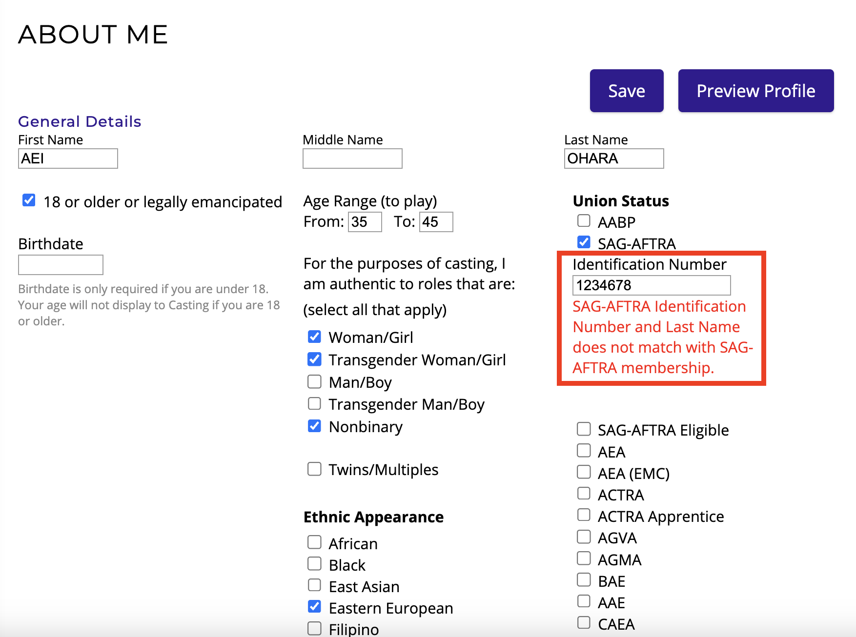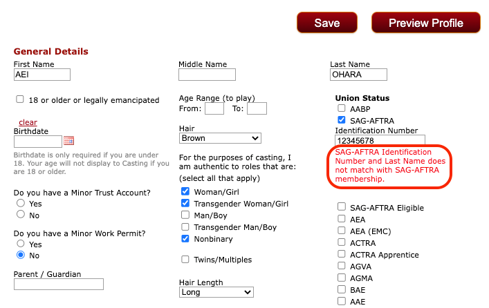 Name Does Not Match - This means that the name you have listed on your SAG-AFTRA membership does not match the name listed on your Actors Access profile. You may need to temporarily change your last or middle name on your Actors Access profile, submit your order for Actors Access PLUS, then change it back.