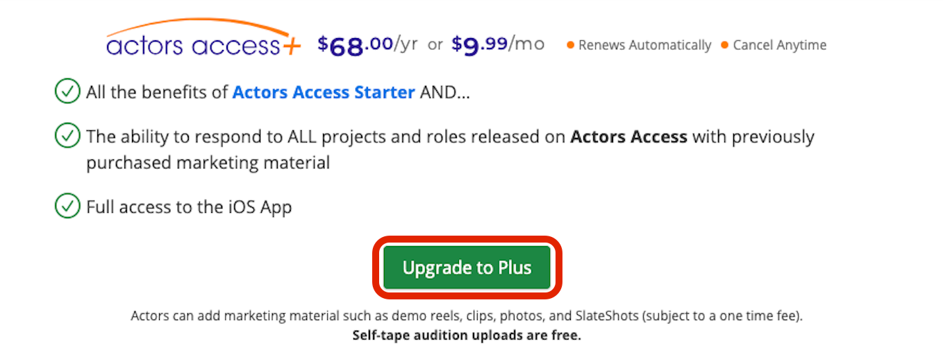 Actors Access PLUS is an optional membership tier available to Actors Access members. Membership costs $68* for a full year, or you can subscribe monthly for $9.99*/month. Monthly subscriptions can be made directly through your Actors Access profile or separately through our iOS App .