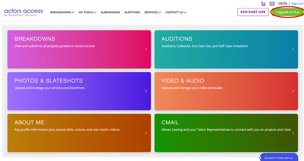 1a) Click on the green Upgrade to Plus button on the top menu bar of your Actors Access profile.