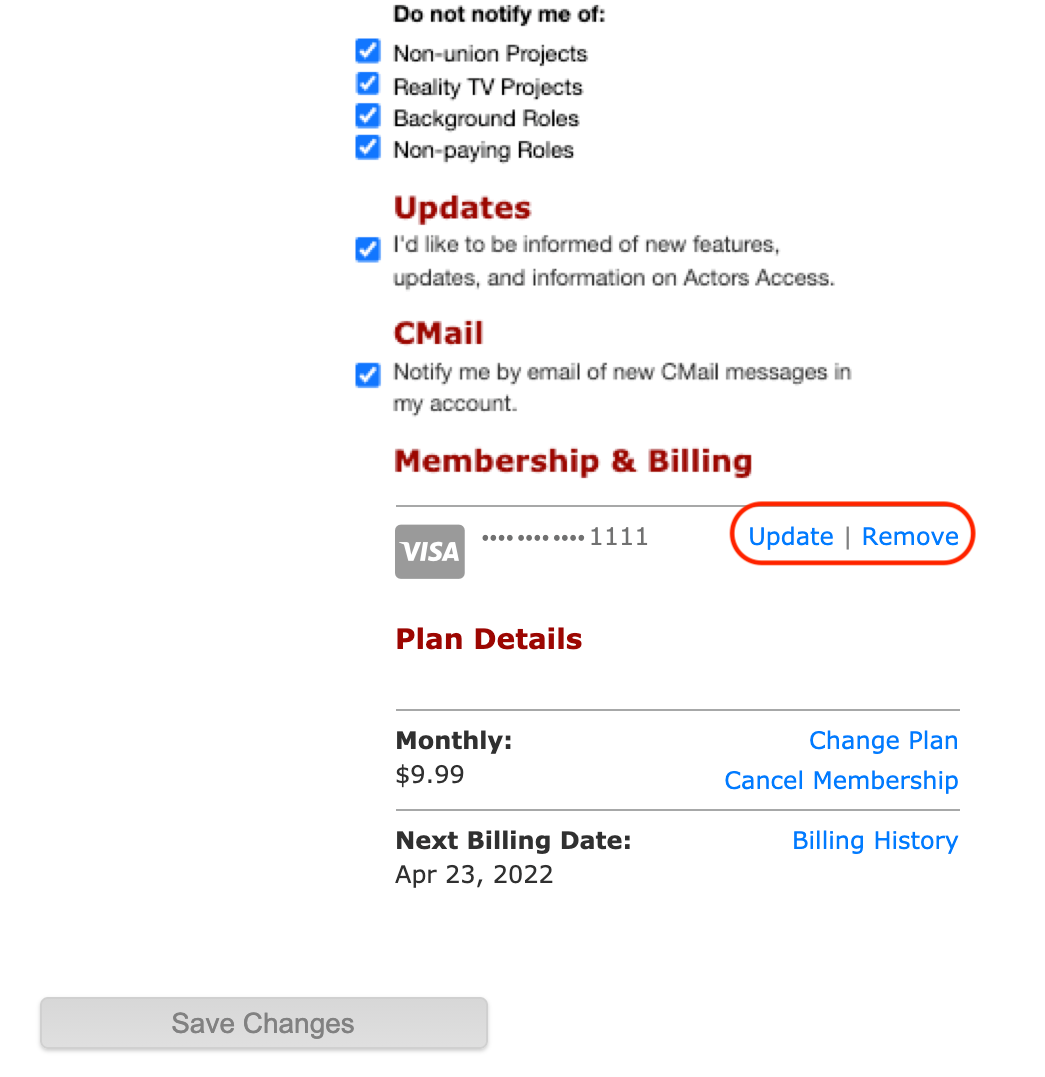 16) Any changes made to your membership through your Actors Access profile will take effect after your current membership expires. For example, if you currently have an Annual Actors Access PLUS membership that expires on January 1st and switch to a monthly membership, you will begin being charged $9.99 per month on January 2nd.