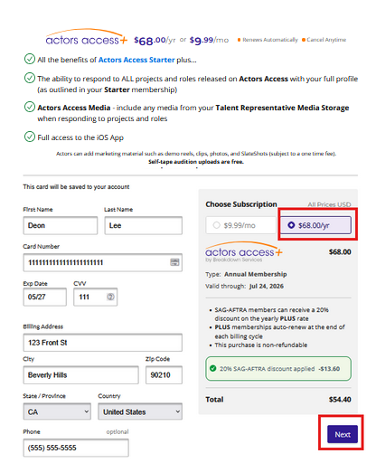 6) If you are a SAG-AFTRA member and have already listed a current Identification Number (also known as Membership ID #) on your profile, this will automatically give you a 20% discount on the yearly subscription and your total will change to $54.40.