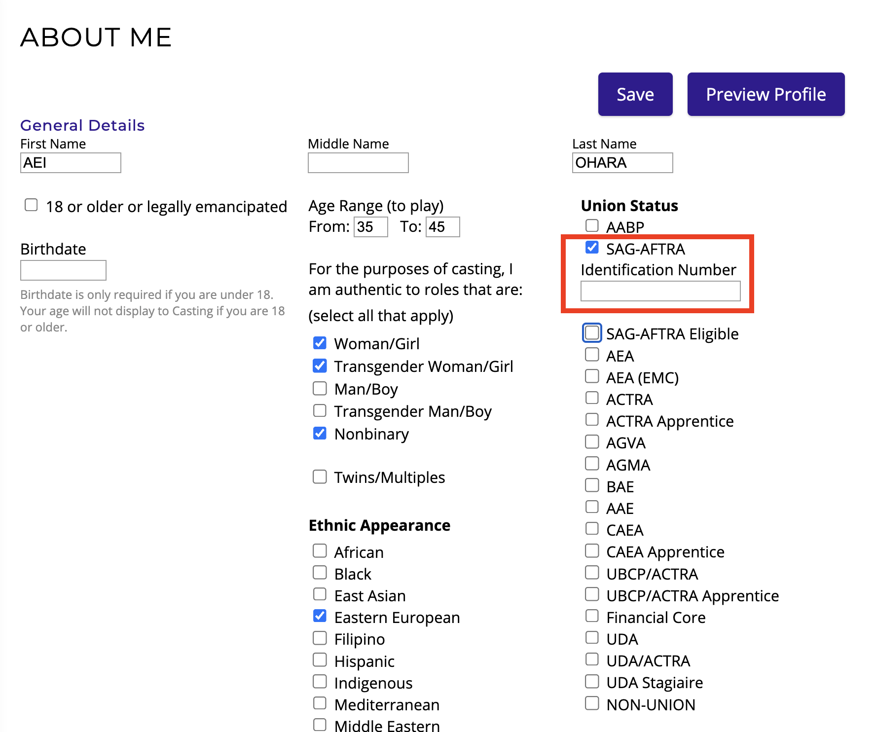 If you only go by one name on your SAG-AFTRA membership, that name will need to be entered as your last name on Actors Access.