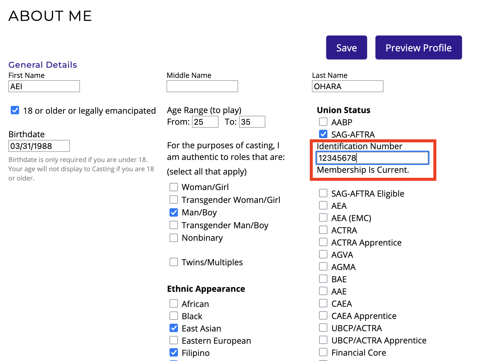 - Select SAG-AFTRA under Union Status