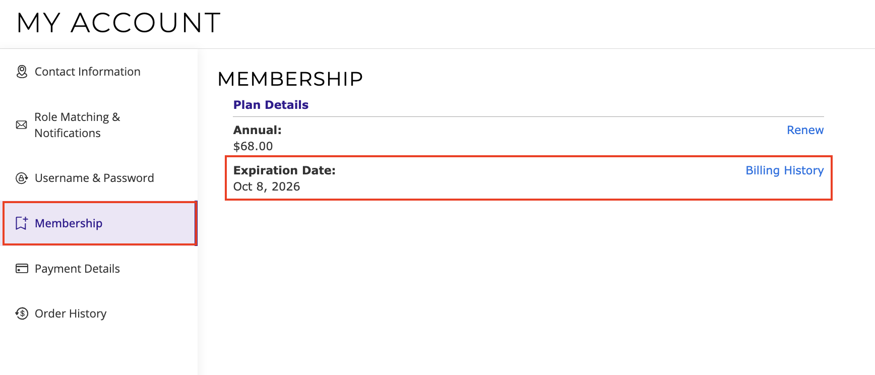 5) You can then go back to your My Account page at any time and add your payment information before your expiration date to allow for auto renewal of your membership, or manually purchase your membership again after it has expired.