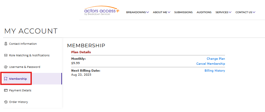 Any changes made to your membership through your Actors Access profile will take effect after your current membership expires. For example, if you currently have an Annual Actors Access PLUS membership that expires on January 1st, 2025, and switch to a monthly membership, you will begin being charged $9.99 per month on January 2nd, 2025.