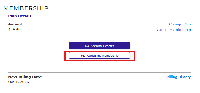 4) Click Cancel Membership. This will prevent any future auto renewals. Your membership will remain active until the end of your current billing cycle, but once your current subscription period is over, your membership will be cancelled and you will lose your benefits.