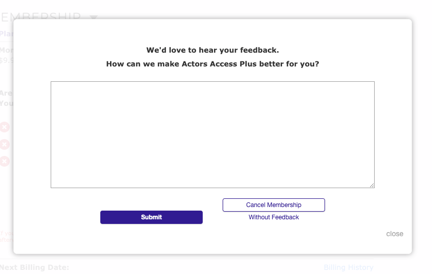 6) A new window will then appear allowing you to share feedback with us. To leave feedback, input your notes into the available space and hit Submit or Cancel Membership Without Feedback if you would prefer not to leave any.