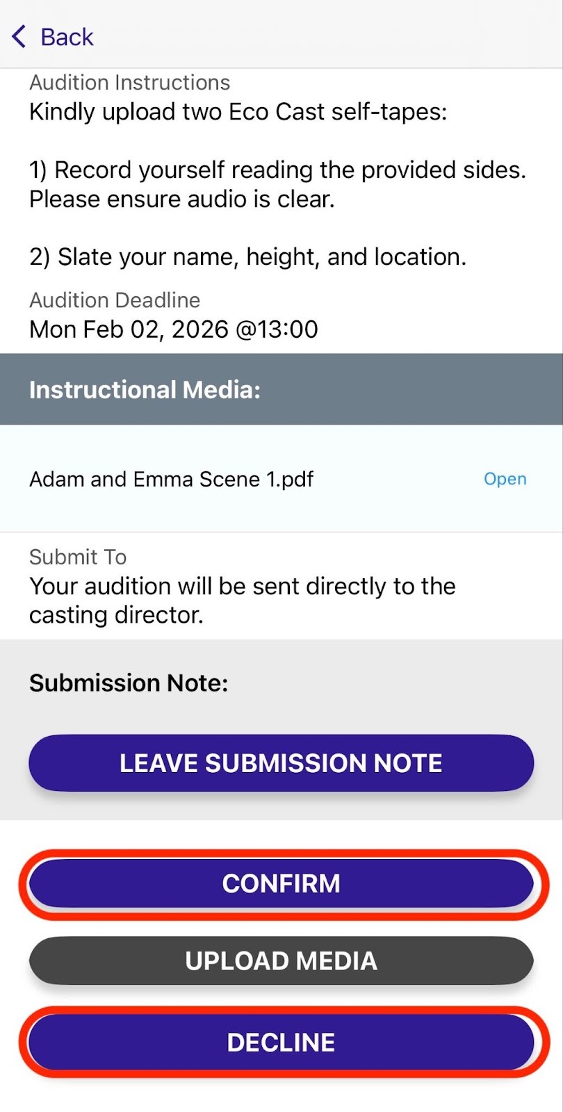 4) At the bottom of the invitation, you will be able to DECLINE or CONFIRM your audition. If you intend on submitting a self-tape, make sure to click on the CONFIRM button. This will also unlock your sides and audition material if Casting has utilized Secure Sides, and you can now click on the red icons to access those files.