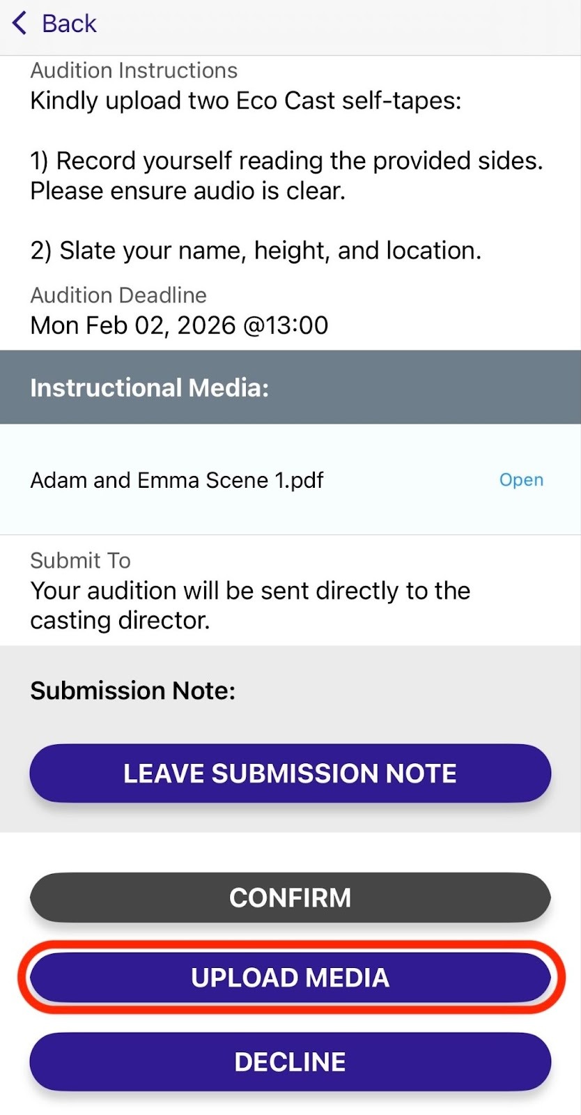6) Once you have your audition files ready, return to the Eco Cast invite. At the bottom of the invitation is a button to UPLOAD MEDIA. Click this button to begin uploading your audition files.