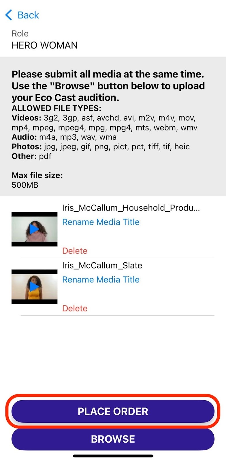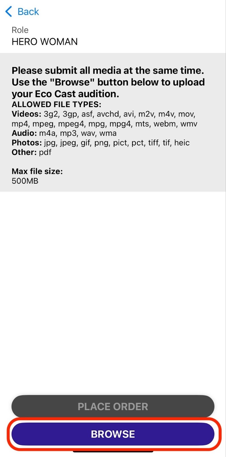 7) Click the BROWSE button to select the first audition file. You will need to find your self-tape in your device by clicking Photo and Videos or Browse. After the first file has started uploading you can click the BROWSE button again to select another file. Repeat until all necessary files are uploaded. Make sure to wait until the files have completed both uploading and encoding before moving to the next step.