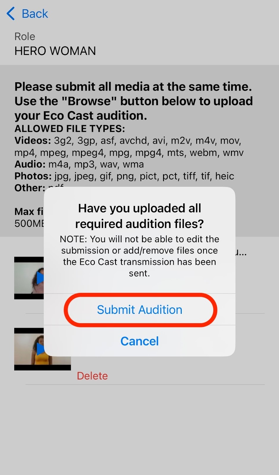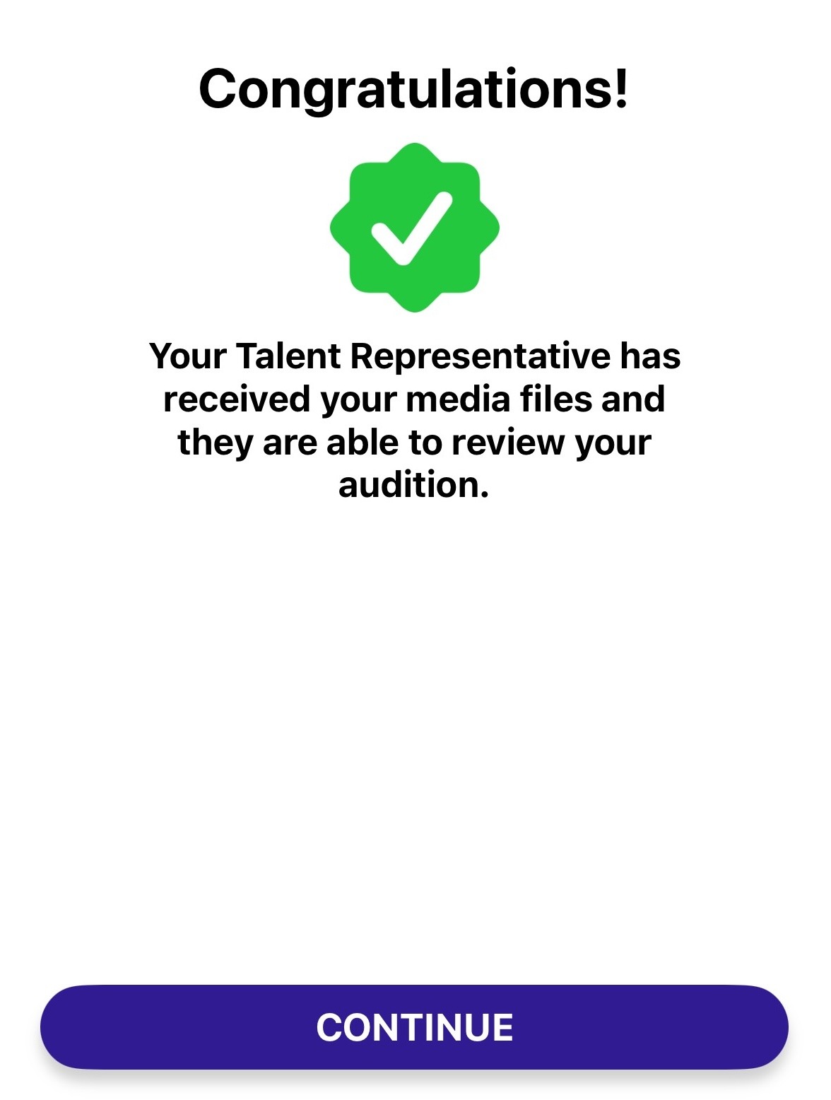 9) Before your submission is finalized, you will see one final reminder that once your files have been submitted, you will not be able to edit or adjust your submission in any way. Click Submit Audition to finish the process and send your files to your Talent Representative or the Casting Director to review.