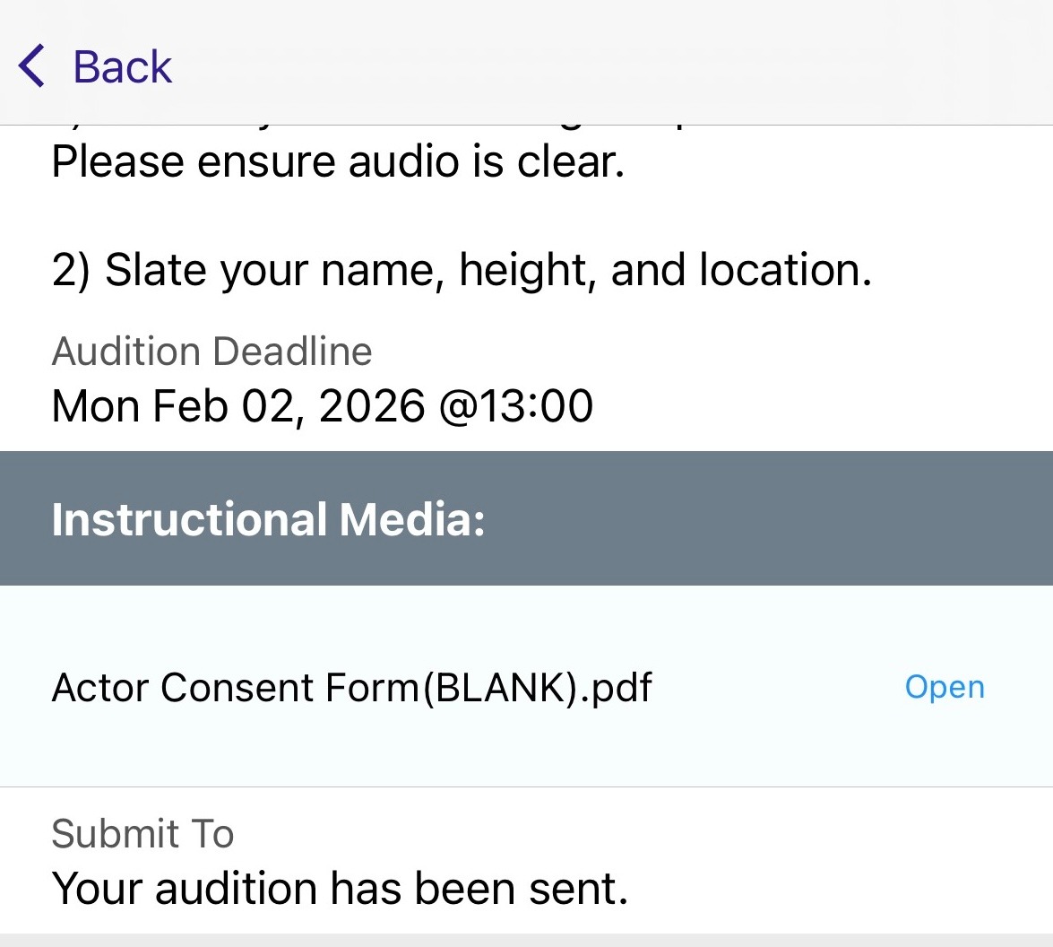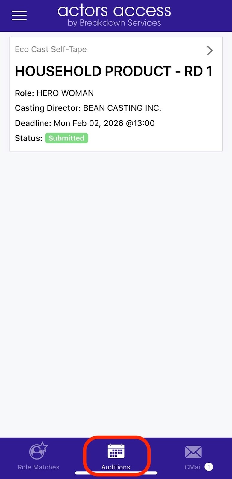 You can view current and past in-person auditions in the AUDITIONS section of your app. Just click on AUDITIONS in your main page.